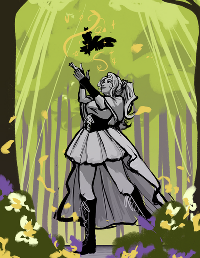 For my initial sketching stage I iterated a selection of outfits that fit the forest theme, but also gave her a "pure", and "soft-hearted" appearance to convey that she is the embodiment of good. I wanted to avoid particularly long skirts, and give her a sturdy set of boots for practicality to live within, or around the forest.