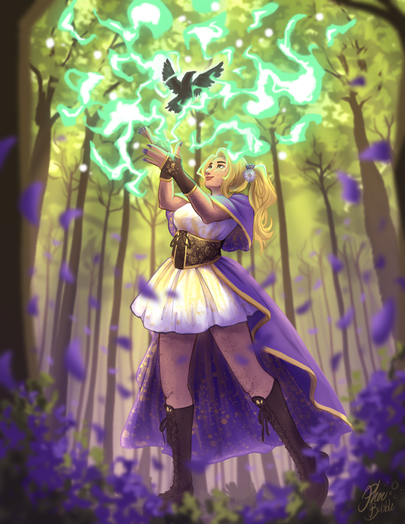 For this project, I was given a mock art test brief that spanned 2 weeks with an end result of 1 full colour concept painting, with the requirements "A human female sorcerer that lives in the forest and is the embodiment of good. The age/time period is up to you. The final image must not be a static view, she should be in action, using her magic in some way, and must be 300dpi and semi realistic."